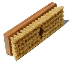 Nylon-bristle brush with wooden base. Can be used by hand or at the end of a broom handle.